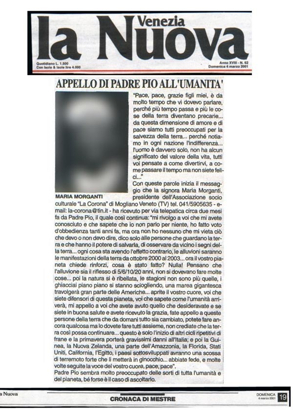 “Pace, pace. Grazie figli miei, è da molto tempo che vi dovevo parlare, perché più tempo che passa e più le cose della Terra diventano precarie… Da questa dimensione di amore e di pace siamo tutti preoccupati per la salvezza della Terra… perché notiamo in ogni nazione l’indifferenza… l’uomo è davvero solo, non ha alcun significato del valore della vita, tutti voi pensate a come divertirvi e come passare il tempo ma non siete felici… Con queste parole inizia il messaggio che la sig.ra Maria Morganti ha ricevuto per via telepatica circa due mesi fa da Padre Pio il quale continua dicendo: “Mi rivolgo a voi che mi avete conosciuto e che sapete che io non parlo per niente, ho fatto voto d’obbedienza tanti anni fa ma ora non ho nessuno che mi vieta ciò che devo o non devo dire, dico solo alle persone che guardano la Terra e che hanno il potere di salvarla, di osservare da vicino i segni della Terra… Ogni cosa sta avendo l’effetto contrario, le alluvioni saranno le manifestazioni della Terra da ottobre 2000 al 2003… Ora il vostro pianeta chiede rinforzi, cosa è stato fatto? Nulla! Pensano che l’alluvione sia il riflesso di 5/6/10/20 anni. Non si dovevano fare molte cose…poi la natura si è ribellata, le stagioni non sono più quelle, i ghiacciai piano piano si stanno sciogliendo, una marea gigantesca travolgerà gran parte delle Americhe… Aprite il vostro cuore voi che siete difensori di questo pianeta, voi che sapete come l’umanità arriverà. Mi appello a voi che avete avuto quello che desideravate e se siete in buona salute e avete ricevuto la grazia, fate appello a queste persone della Terra che da domani tutto sia cambiato, potete fare ancora qualcosa ma lo dovete fare tutti assieme, non crediate che la Terra così possa continuare… Questo è solo l’inizio di altri cicli ripetitivi di frane e la primavera porterà gravissimi danni all’Italia: e poi la Guinea, la Nuova Zelanda, una parte dell’Amazzonia, la Florida, Stati Uniti, California, Egitto, i paesi sottosviluppati avranno una scossa di terremoto forte che li metterà in ginocchio. Abbiate fede, e molte volte seguite la voce del vostro cuore. Pace, pace…” |